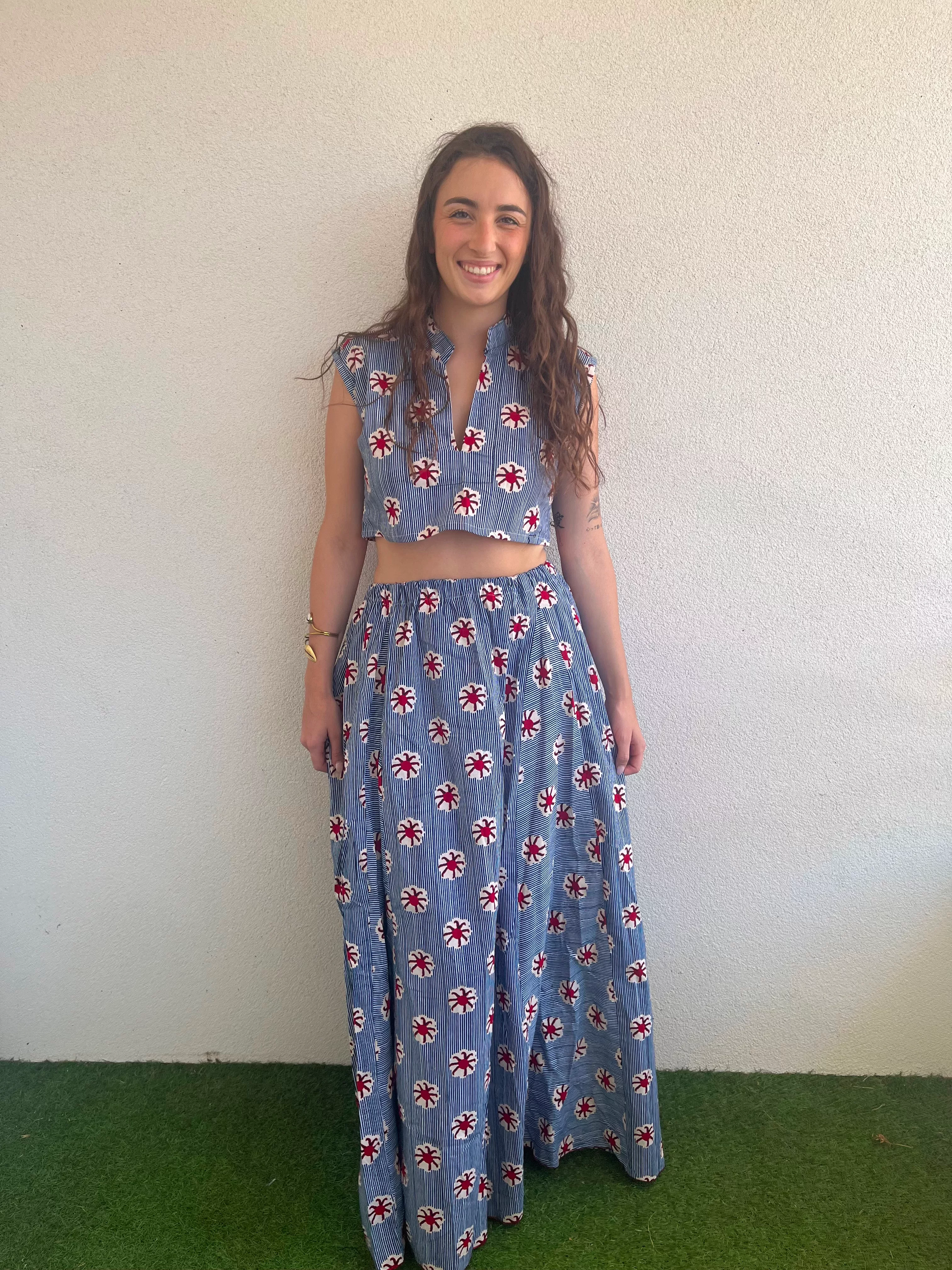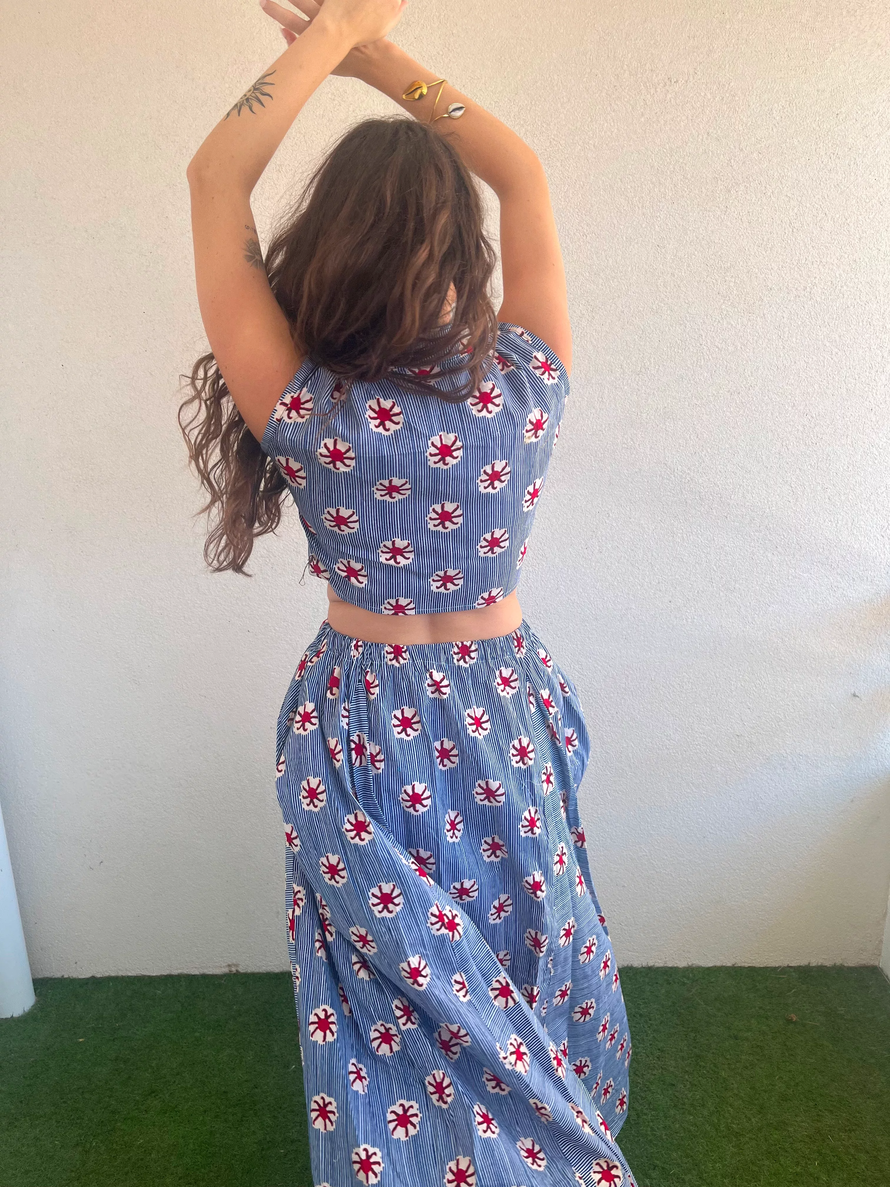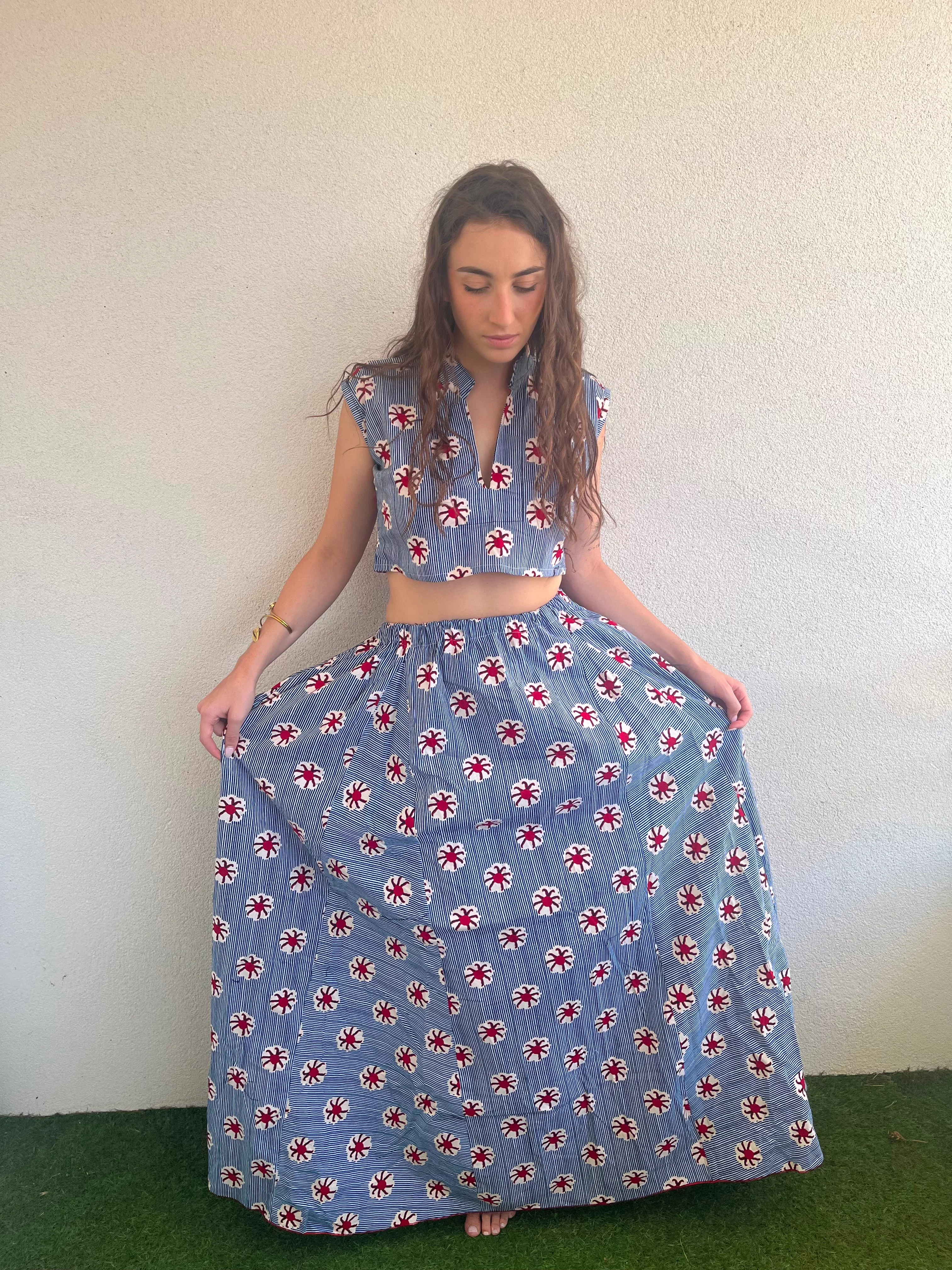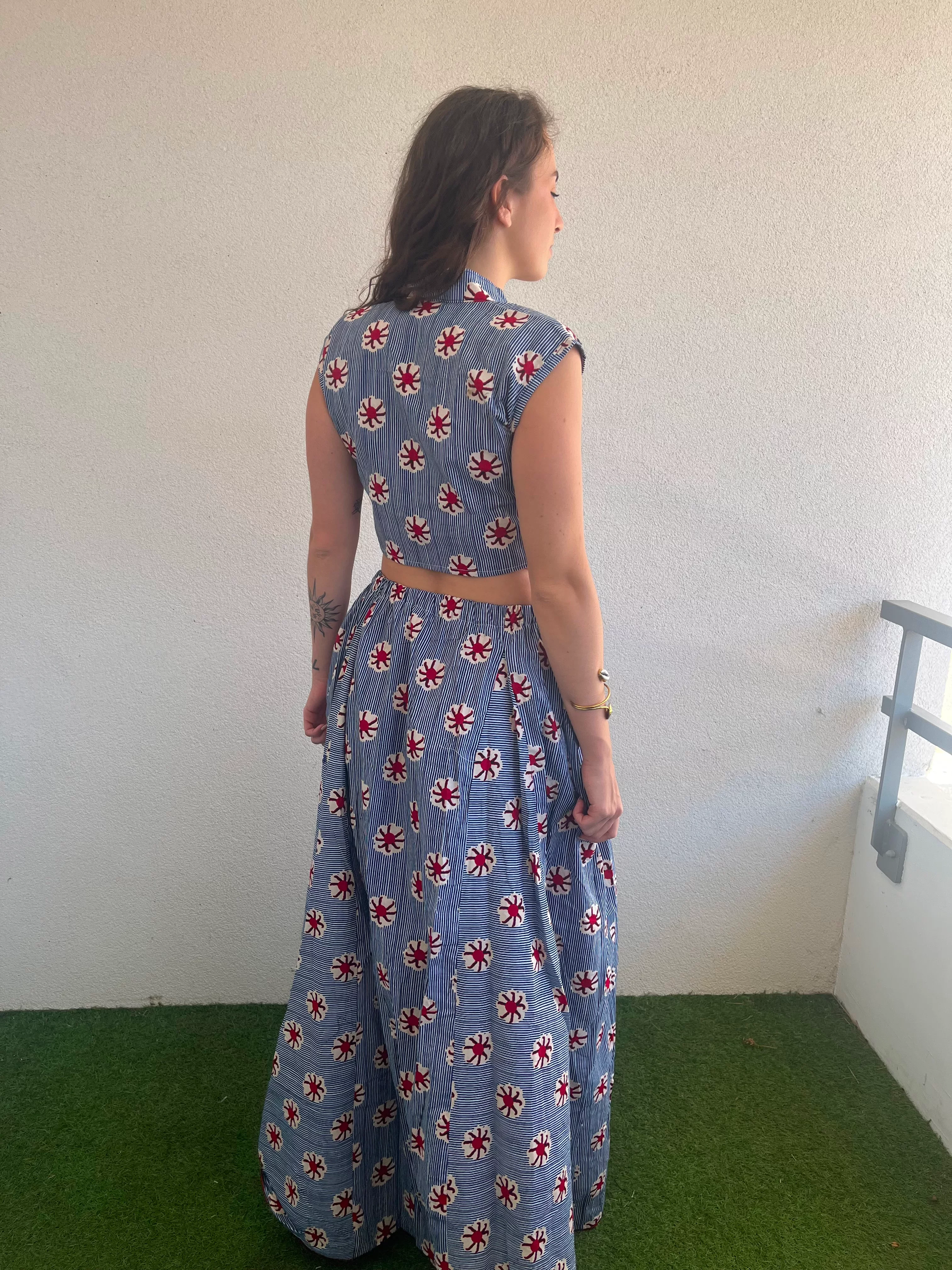 Découvrez l’ensemble Solea Bleu, composé d’un crop top structuré et d’une jupe longue fluide, confectionnés dans un tissu léger aux motifs floraux rouges et blancs. Le top présente une coupe moderne avec encolure ouverte, tandis que la jupe offre un volume élégant et confortable. Un ensemble estival, artisanal et unique, parfait pour mettre en valeur une silhouette naturelle tout en profitant d’un confort absolu.